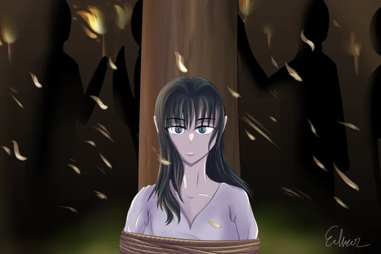 Long dark hair drapes a lady flowing in white, bound to a wooden pole among hooded figures that surround her with torches in their hands. The orange glow of their fires illuminates her resigned smile, but without fear, she looks directly ahead.