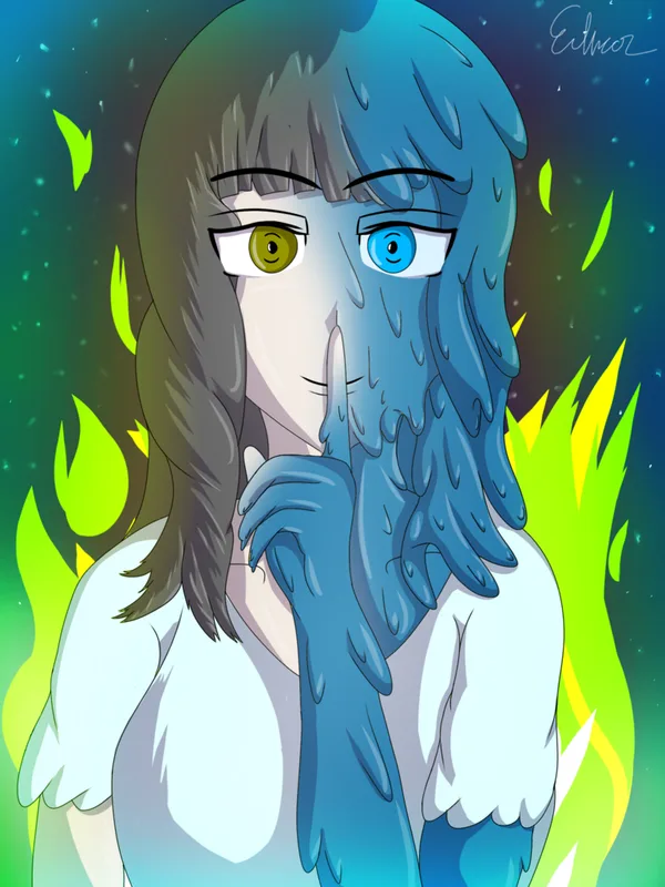 “Wait! Maybe…” they both say at the same time. Then, the naked one raises her arm, flattening it into a sharp blue blade.