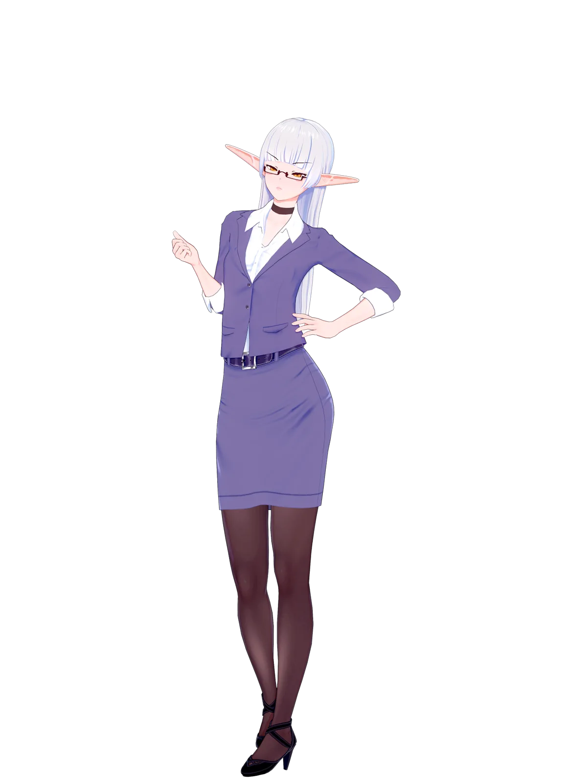 Nova’s new uniform consists of a white dress shirt, a buttoned-up purplish-blue coat, and a tight medium pencil skirt of the same color. A dark pantyhose covers her skinny legs as she stands on top of a pair of black medium ankle-wrap heels. Her glasses and slave choker remain on their proper spot.