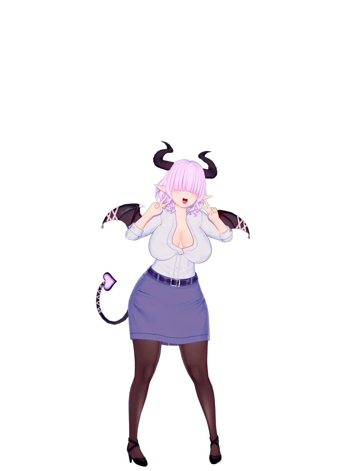 “Nov-Nov, yo! Pretty cute, huh~?” Pink smiles, doing a cute pose to show off her new outfit. Practically the same clothes that the elf wears, with a tight purplish blue pencil skirt over dark pantyhose and elegant high heels. The difference with hers being the lack of a blazer and the sultry decision to leave half of the buttons on her tucked shirt undone…