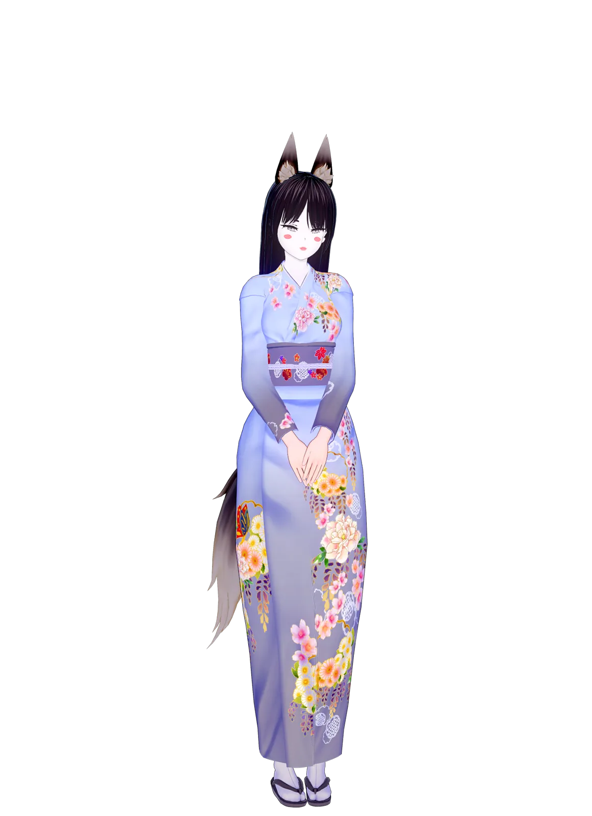 Makoto’s face is completely covered in white powder, her lips and cheeks embossed with red paint. She has tilted, almond-shaped grey eyes, pitch-black long hair, and small, thick eyebrows. Two dark, fox-like ears rest on top of her head and a fluffy tail waves from side to side atop her backside, making it obvious she proceeds from Kaimū, the land of the kitsunes.