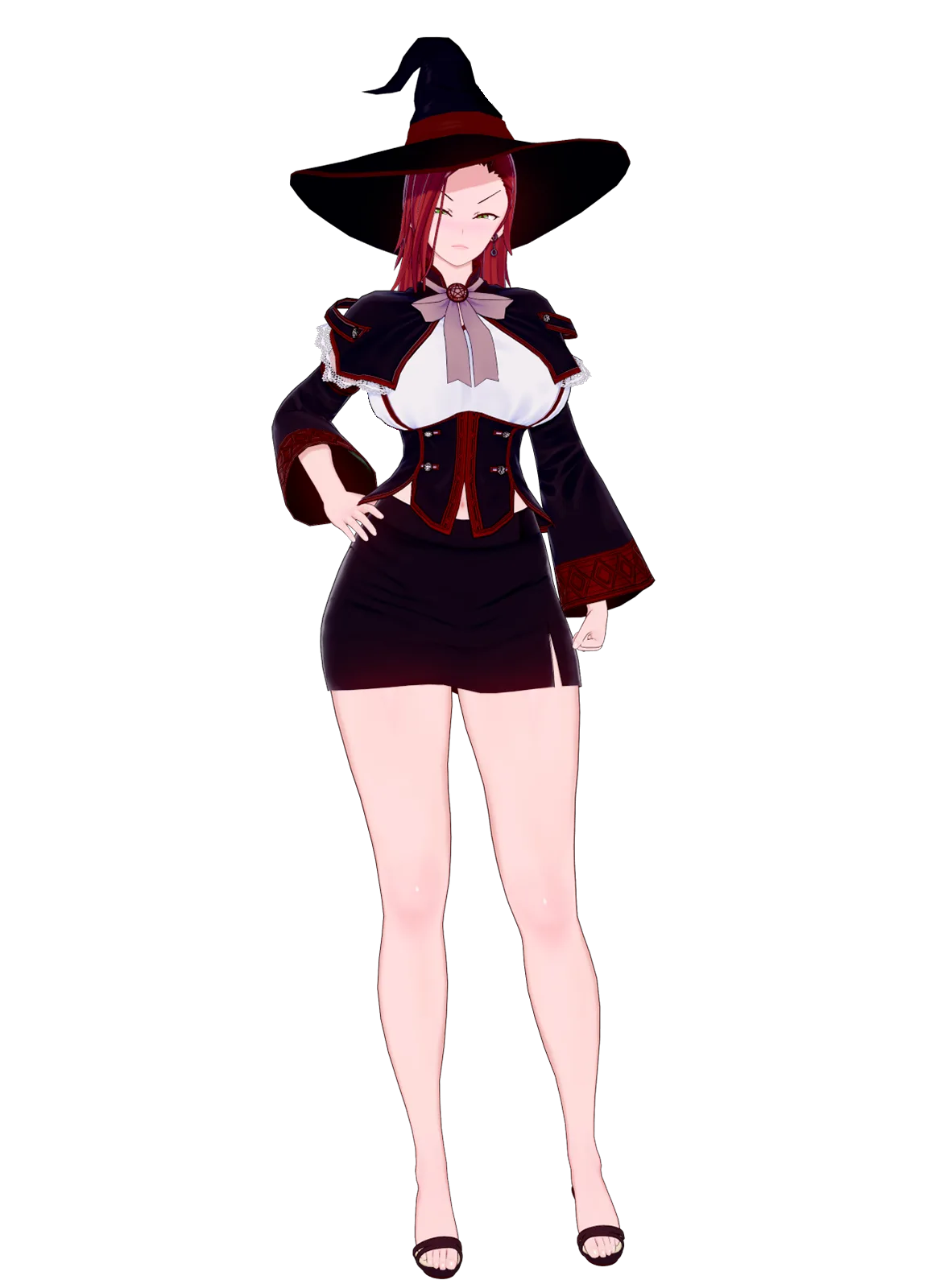 The bratty woman stands at five foot eight, just an inch smaller than Olivia. With long tinted dark-red hair covering one side of her face, bright green eyes, and thin, wide expressive eyebrows. She wears a white button shirt, that barely contains her pair of sizeable tits, under a small cape and leather corset. Below, a tight skirt clings to her wide hips and round ass, not bothering to hide much of her long, shapely legs. The sorceress also has dark strap heels, long floppy sleeves, a wide-brimmed witch hat with a crooked tip, and an expensive golden wedding ring wrapped around her finger.