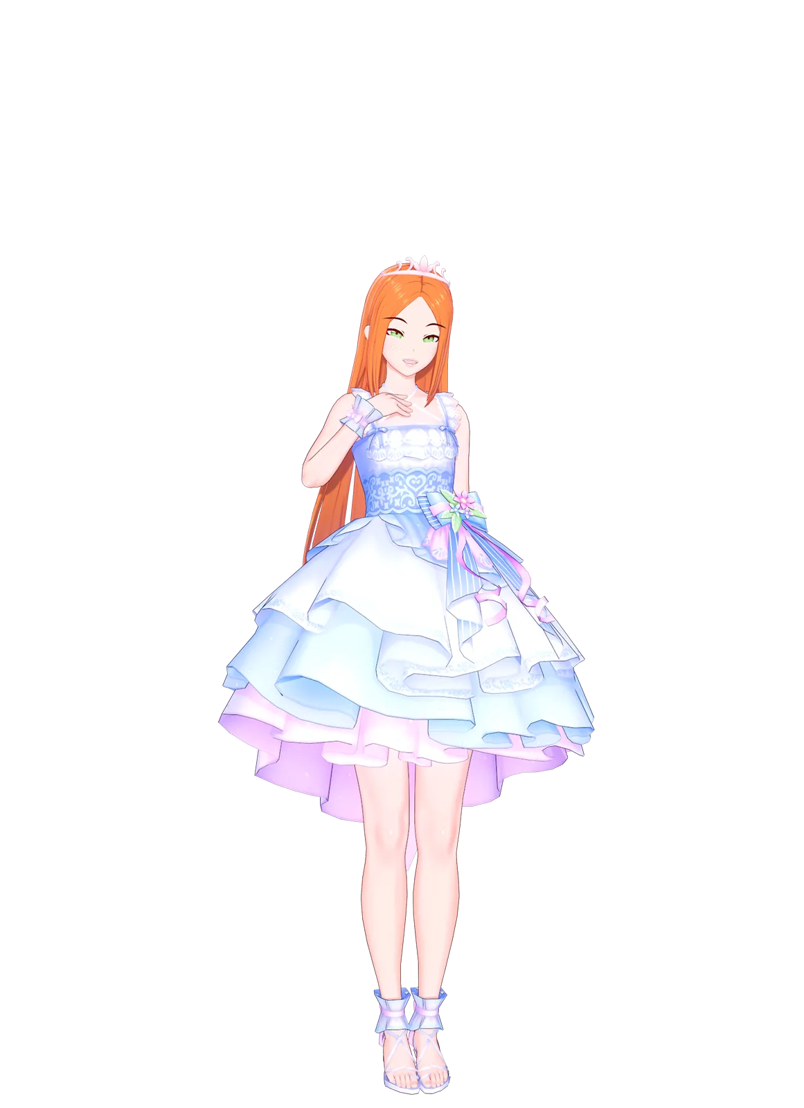 She wears a very, very impractical frilly sleeveless dress of pastel colors that reaches a couple of inches above her knees. High heels cover her dainty feet and a tiara rests on the top of her head.